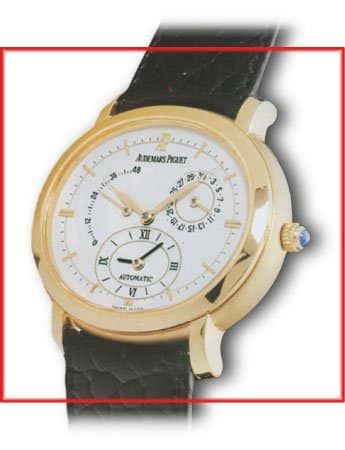 Das Zifferblatt hat white enameled, applied yellow-gold markers, printed minute track, yellow gold hands und die Luenette ist . Das Werk ist mechanical with self-winding, Audemars Piguet caliber 2129/2845, 35 jewels, 21, 600 vph., 45-hour power reserve, Côtes de Genève pattern.