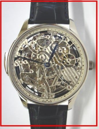 Das Zifferblatt hat skeletonized dail, blue hands und die Luenette ist . Das Werk ist skeletonized mechanical with manual winding, IWC caliber 95911, 54 jewels, 18.00 vps., power-reserve about 43 hours.