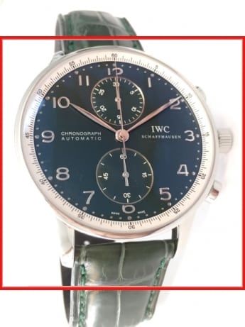 Das Zifferblatt hat Arabisch Zahlen, Farbe Grün, Zeiger in 18 kt Gold und die Luenette ist Edelstahl, Poliert. Das Werk ist Gangreserve 44 Std., Halbschwingungen A/h 28800, Mechanisch mit automatischem Aufzug, IWC Kaliber C.79240.