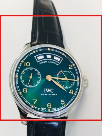 Das Zifferblatt hat Arabisch Zahlen, Farbe Grün, Index, Zeiger in 18 kt Gold und die Luenette ist Edelstahl, Poliert. Das Werk ist 36 Rubine, Gangreserve Anzeige, Halbschwingungen A/h 28800, Mechanisch mit automatischem Aufzug, IWC Kaliber 52850.