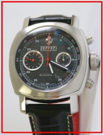 Schwarz guillochiert, aufgesetzte Indexe & arabische Ziffern, bei 12 Uhr Ferrari Logo, Zeiger mit Leuchtmasse