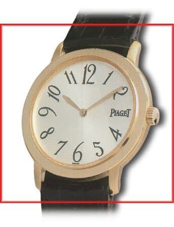 Das Zifferblatt hat silvered, printed arabic numerals, flat gold hands und die Luenette ist . Das Werk ist mechanical with manual winding, extra thin, Piaget caliber 430P (base caliber Piaget 9P).
