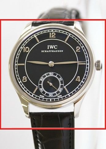 Das Zifferblatt hat schwarz, aufgesetzte arabische Ziffern und Zeiger in Weissgold und die Luenette ist . Das Werk ist mechanisches IWC Werk mit Handaufzug, IWC Kaliber 98295, 22 Lagersteine, 18.000 A/h 2, 5 Hz, Gangreserve 46 Stunden, Unruh mit Gewichten und Feinstregulierexzenter auf den Unruhramen, Breguet Spirale.